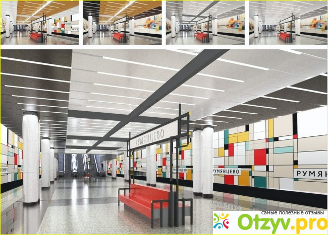 На изображении видно как красиво выглядит станция метро"Румянцево", черное с белым колонны, ярко-красные скамейки, и геометрической формы рисунки на стенах, просто завораживает! (смотрите на фотографию расположенную снизу):