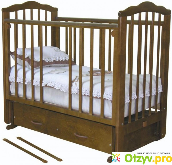 Достоинства: у кроватки есть маятник, три уровня высоты,выдвижной ящик для детского белья,сделан из натурального материала
