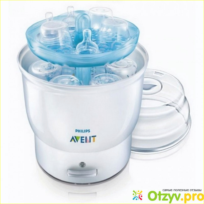 Достоинства: насадка для сосок и бутылок, сам отключается, хорошо стерилизует