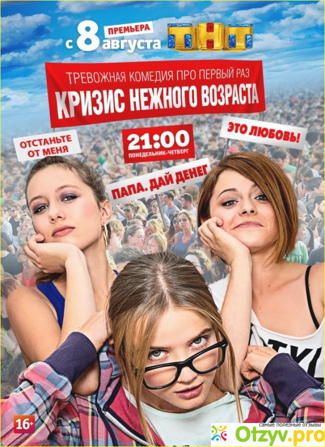 Начала смотреть сериал Кризис нежного возраста на ТНТ. Сначала не очень мне понравился, так как мне показалось, что в сериале маловато юмора. Но потом увлекла любовная линия между двумя Сашами.Вообще, фильм рассказывает о трех девушках, которые дружат, которые относительно недавно...