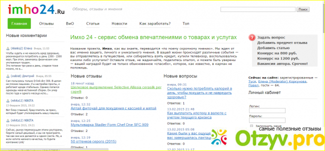 Примерно прошлым летом узнала о существовании сайта платных отзывов Imho24.ru, зарегистрировалась. Там можно писать и отзывы, и статьи. Какой-то четкой суммы оплаты нет, сказано, что за отзыв платят не менее 5 рублей, а за статью не менее 10, но по факту не угадаешь, за что и сколько...