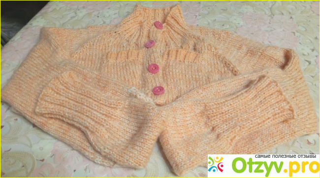 Кофточка, в целом ничего... Понравилась. Пряжа, чувствуется, мягкая на ощупь (по крайне мере, визуально создается такое впечатление). Но попробуйте подобрать другие пуговицы по оттенку. Пряжа, из которого выполнено изделие - персикового цвета, с белым вкраплениями....