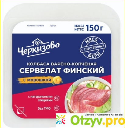 Люблю этот сервелат от фирмы Черкизово. Он продаётся в виде нарезки. Нарезан на аккуратные тонкие колёсики. В срезе однородный, без каких-то непонятных вкраплений. Сервелат упругой консистенции с натуральным ароматом пряностей и душистых специй. Содержит натуральное мясо, и это тоже...