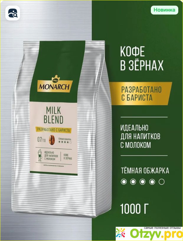 Пришла мне моя упаковка кофе Monarch milk blend. Стильная, целая, хорошее качество, с клапаном. Аромат у кофе сильный, чувствуется сразу. Цвет зерен довольно темный. Это кофе темной обжарки, зерна обжарены равномерно, выглядят довольно неплохо, нет лома. Перемалываю и варю в турке. При...