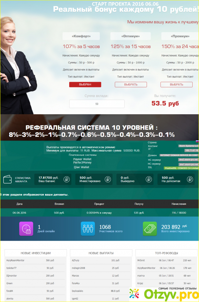 Я написал этот отзыв, для того, чтобы предостеречь всех, кто хочет попробовать получить большую доходность их таких хайп проектов, подумайте прежде чем переводить деньги мошенникам. Но к сожалению, многие надеются, что они будут первыми на проекте и смогут получить огромные деньги. Если мы не будем доверять таким мошенникам, и пользоваться этими сайтами, то их будет намного меньше.