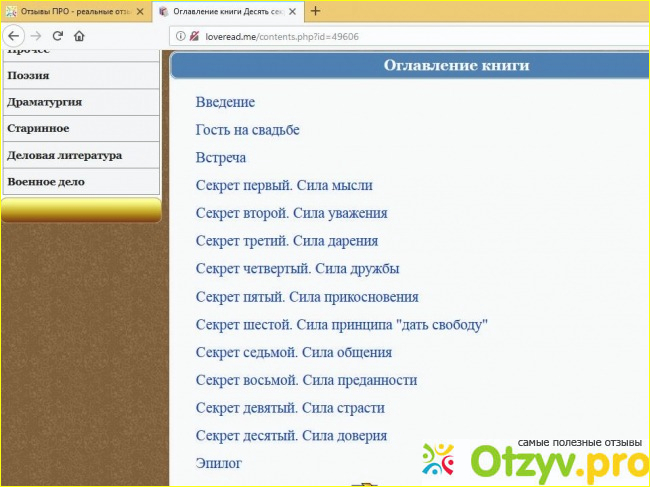 Поэтому писать о богатстве, здоровье, счастье, любви он имеет полное право. Почему бы не поверить автору, человеку, который добился расположения в обществе. В книге про десять секретов любви раскрыто и описано все подробно. Каждый секрет представляет собой отдельную главу и отдельную историю. Получается в книге описываются судьбы 10 людей, которые достигли познания истинной любви и нашли себя, не остались одиноки. Каждый человек в мельчайших подробностях описывает свое состояние, учит, как надо поступать и пойти правильным путем. В конце каждой главы даются основные истины и итог. Все это настолько легко преподнесено, что легко можно запомнить. Но все же главным персонажем является молодой человек, он посещает всех указанных по номерам в бумаге в поисках истин о любви.