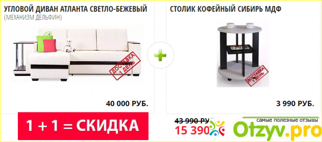 Самые последние, топовые товары по акции: диван "Атланта" (30000 рублей) и стол журнальный "Бета гранд" (8990 рублей)-18390 рублей; диван "Амстердам Евро" (18000 рублей) и стол журнальный "Сибирь" (3990 рублей)-12150 рублей; диван "Атланта" светло-бежевый (30000 рублей) и стенка "Ибица" (5990 рублей)-16490 рублей; угловой диван "Атланта" светло-бежевый (40000 рублей) и столик кофейный "Сибирь" (3990 рублей)-15390 рублей; угловой диван "Атланта" (40000 рублей) и шкаф-купе с зеркалом "Бася" (10990 рублей)-19690 рублей. И другие комплекты. Их около тридцати.