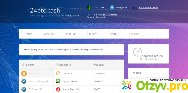 прямые переходы приходить отказываются. Система отлично работает. Благодаря 24btc.cash получилось оперативно вывести средства на приват 24, без задержек и накладок как в других системах. При этом очень просто и легко разобраться в интерфейсе системе. Раньше из-за замудренного механизма других систем, даже боялась пользоваться. Очень удобно то, что можно работать сразу и с btc, qiwi и wm. Довольна простотой, скоростью работы системы, ее техническим облуживанием. Воспользуюсь еще не один раз. Очень удобно, что можно и вводить, и выводить средства, а также работать с другими банками, например, Сбербанк и ВТБ. Я уже всем родственникам сказала, что бы мне начисляли на любой из счетов электронных откуда им удобнои я уже могла выводить себе в банк или на карту. Интересно, что курсы в системе могут меняться, т. е. если отслеживать через мониторинги (или руками) то можно не спешить с выводом денег и обменять, когда курс выгодней, чем у других на комиссию. в целом, если переводить через множество систем, без обменных пунктов. получится дороже. поэтому обменный пункт намного быстрей и проще