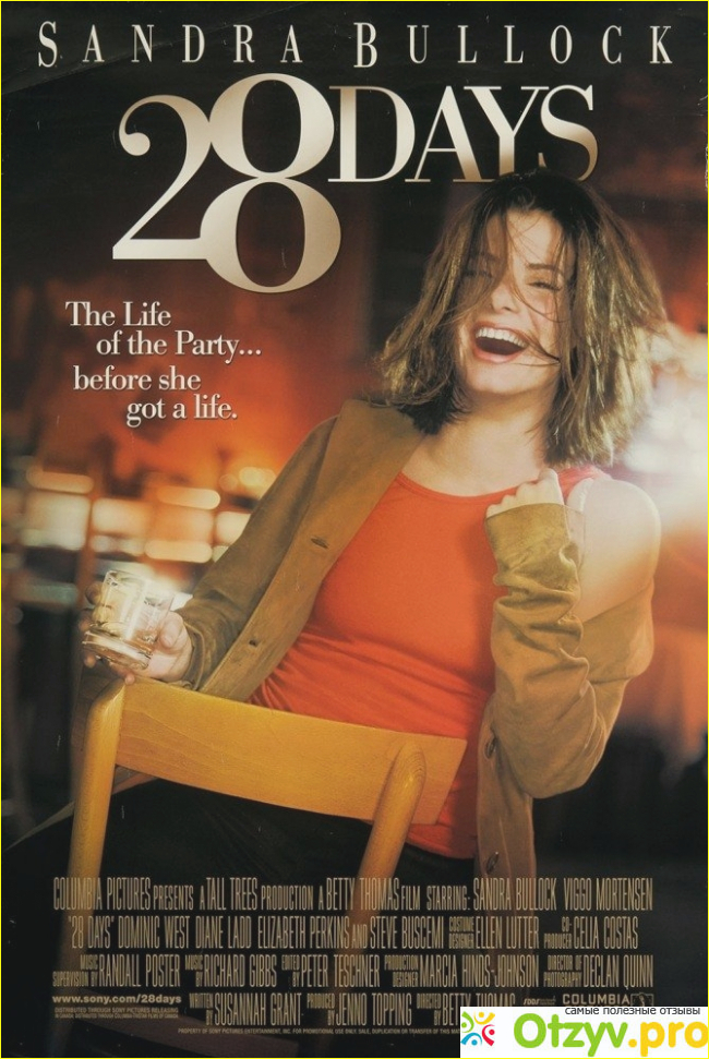 Без лишних слов представляю вам главного героя этого отзыва — кинокомедия «28 дней», вышедшая на экраны в 2000 году. Режиссёром сие творения — Бетти Томас, возможно зрителям будут знакомы её предыдущие работы в кино — «Части тела» (1997), «Доктор Дулиттл» (1998) и другие. Главные роли в картине исполнили: Сандра Буллок, Вигго Мортенсен, Доминик Уэст и другие.