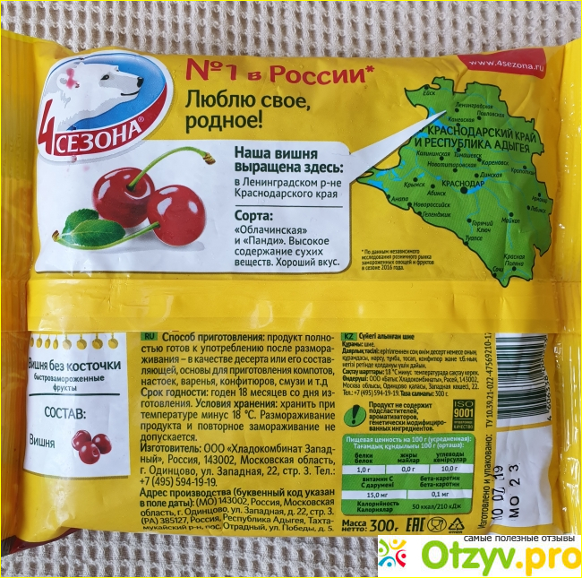 Мои дети просто обожают вишню, поэтому в сезон я покупаю ее в больших количествах, кое-что успеваю заморозить, что-то превратить в компот и варенье, но запасов на всю зиму не хватает. Поэтому в этот период я покупаю замороженную вишню без косточки. Я пробовала разные виды данного продукта от разных производителей, но остановила свой выбор на варианте от “4 сезона”.
