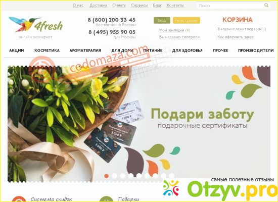 "4fresh.ru"-интернет-магазин натуральной косметики и не только косметики. Думаю, что уже очень многие из нас пользуются активно интернет-магазинами, во-первых это удобно, можно заказать все что угодно, во-вторых надежно, многие сайты дорожат клиентами и не "кидают" из на деньги и товар, в-третьих это быстро, так как платная доставка со стороны сайта оказывается быстрее "Почты России", к тому же многие интернет-магазины имеют свои склады по все России, что позволяет получать курьером посылки не только в Москве, но и в Санкт-Петербурге, и в Екатеринбурге. Данный интернет-магазин обладает обширным каталогом, и разными, и разными способами оплаты, и доставки.