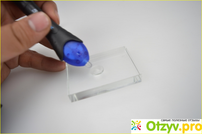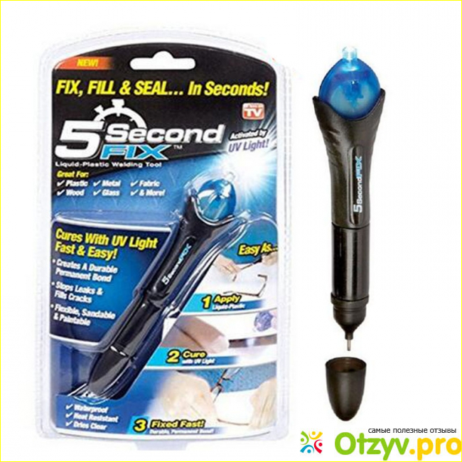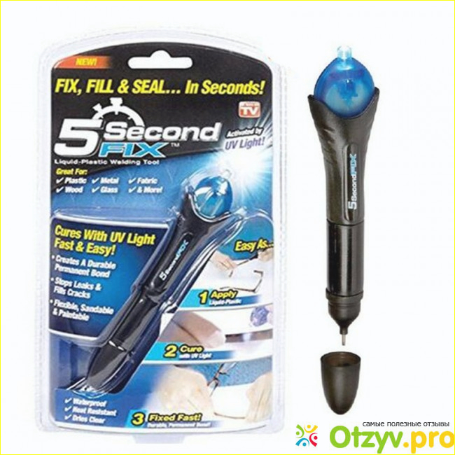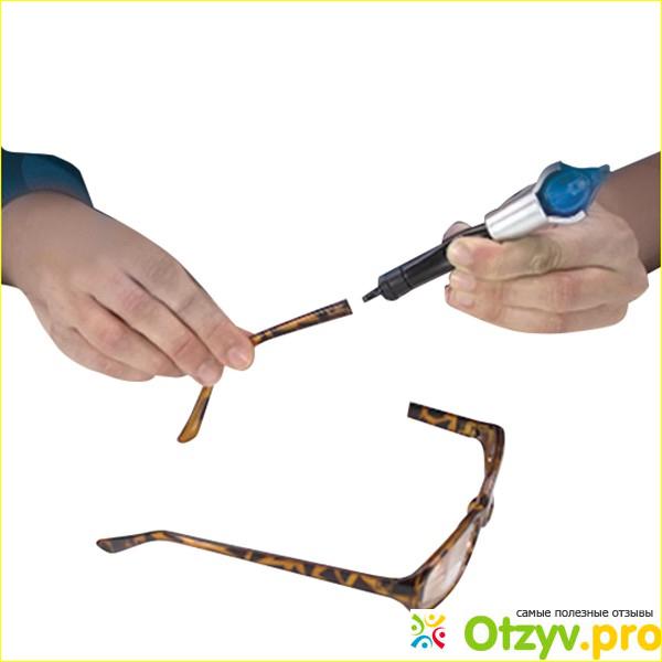 Горячий клей отличается от обычного тем, что по своей сути является жидким пластиком, который становится твёрдым при ультрафиолетовом освещении (лампочка находится на обратной стороне ручки). С его помощью можно создать прочную связь для любых материалов. Он идеально подойдет для ремонта пластиковых, деревянных, металлических, резиновых изделий, изделий из фарфора и стекла.