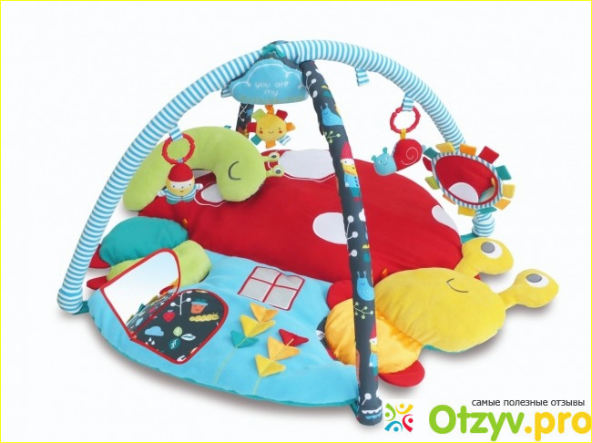 Размер мягкого основания 109-102 см. Накрест располагаются две дуги, на которых есть множество игрушек, прорезыватель для зубов, колокольчики, большое безопасное зеркало. Это игровой комплекс для малышей. Он также оснащен музыкальном элементом. Он предполагает звучание нескольких мелодий, детям это очень нравится, однако родителям могут надоедать бесконечно воспроизводимые звуки. Коврик изготовлен из мягкой, но прочной ткани, его можно стирать. Все элементы безопасны и имеют сертификацию.