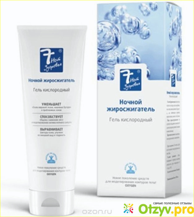 В составе содержит экстракты куркумы и цикория, пользоваться нужно перед сном, в состоянии покоя Гель кислородный Семь нот здоровья "Ночной жиросжигатель" действует (должен), как активизатор кровообращения в верхних слоях кожи и мышцах.