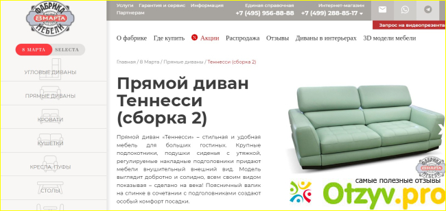 В Москве и Подмосковье у них немало своих салонов, которые торгуют напрямую от фабрики. В нашем случае мы выбрали ближайший салон на улице Ленинская Слобода в МЦ ROOMER. Там у них довольно большой шоурум, где выставлены многие модели. Всё можно посмотреть и пощупать воочию, сразу примериться, выбрать диван по материалам, дизайну и, естественно, цене. Человек так устроен, хочется всегда как можно более качественную и дорогую мебель. Выбирали долго и в конечном итоге остановились на прямом диване «Теннесси». Там много разновидностей из этого модельного ряда, где можно выбрать не только угловые, но и прямые диваны.