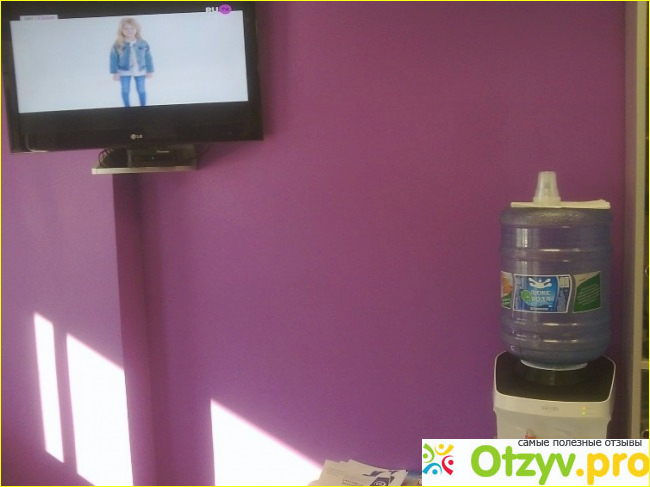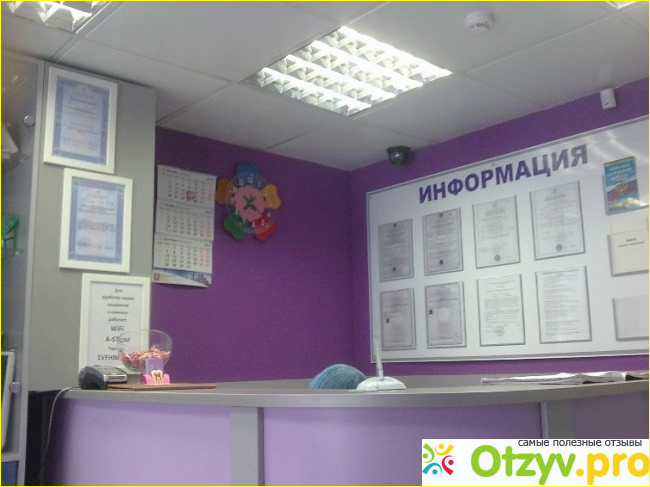 Дизайн в фиолетовом цвете - визитная карточка клиники. У входа находится стол с чистыми бахилами и корзина, в которую нужно складывать использованные бахилы. Холл небольшой, с белым диваном, кулером, телевизором и шкафом с разными стоматологическими принадлежностями.