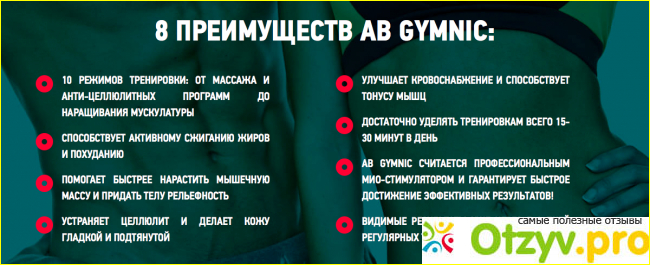 Благодаря поясу Ab gymnic человек может не затрачивать время на тренировки, но получать эффект от спортивных занятий - подтянутый живот, мышечный корсет и стройную талию.