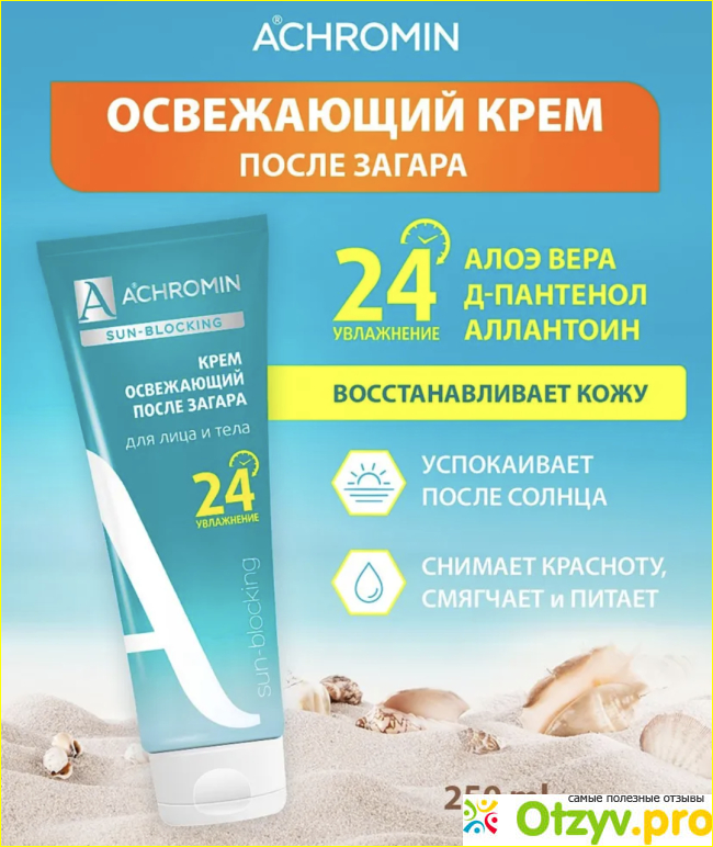 Привет) Крем освежающий после загара для тела и лица купила в составе набора для ухода за кожей ахромин, он был в комплекте с солнцезащитным кремом этой фирмы. Опробовала его в феврале, когда мы ездили в отпуск. Туба большая, 250 миллилитров, у меня осталось еще прилично, летом пригодится.