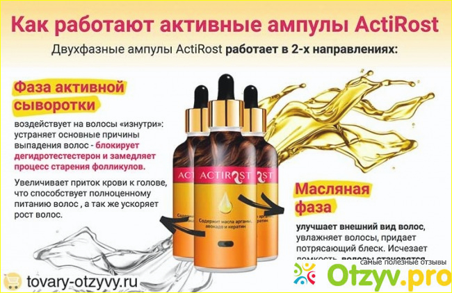 ActiRost – сыворотка для ускорения роста волос, препятствующая образованию залысин и уменьшению густоты прически. Возрождает замершие луковицы, позволяет в короткие сроки добиться роскошного результата.