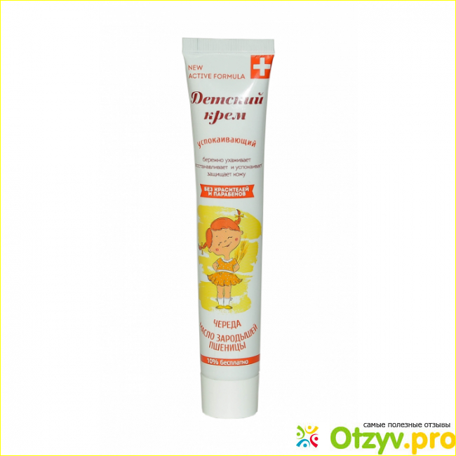Ну, у нас была еще и причина – постоянные покраснения на теле. Педиатр в поликлинике посоветовала иногда купать в череде, чтобы успокаивать проблемные участки кожи, но купание не очень помогало, и я нашла этот крем. Обычный тюбик, белого цвета, в объеме 44 мл. Имеет нейтральный запах, это плюс. Закручивающаяся крышечка.
