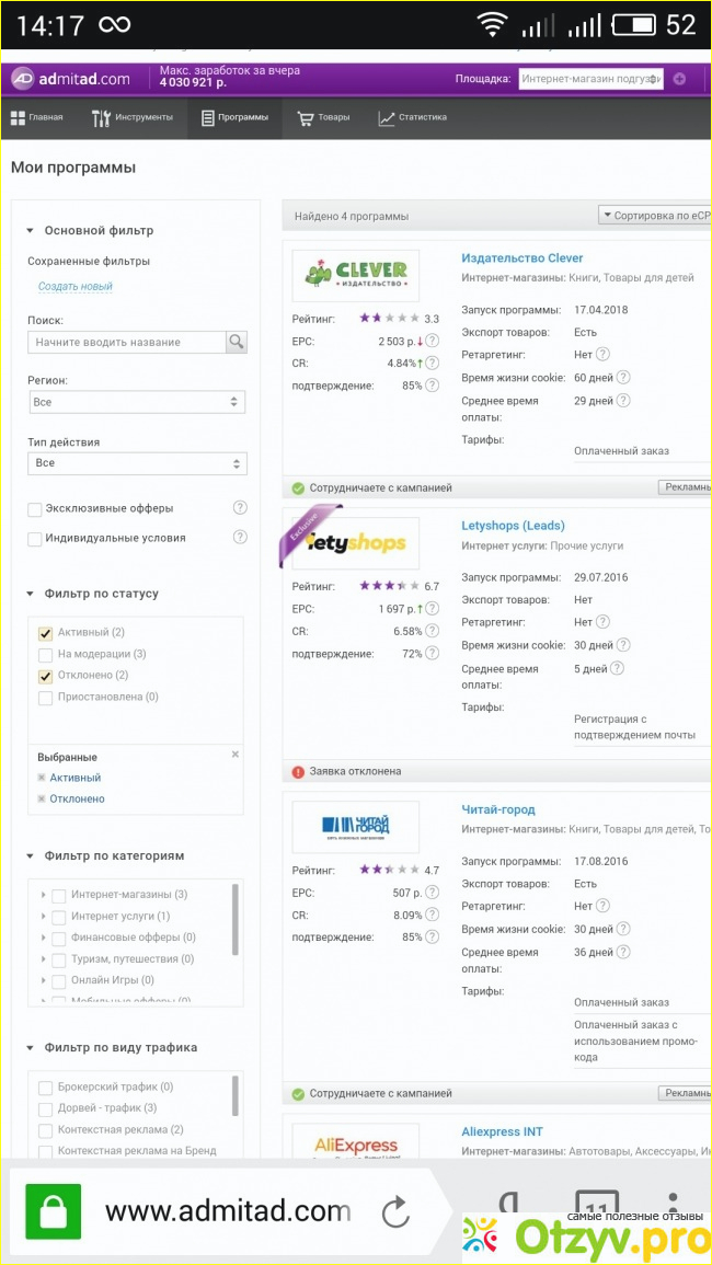 Трафик отборный, поэтому особых проблем нет. Не нравится иногда жетская модерация со стороны реклов, уж очень круто они берутся за дело, что больше мешает, чем помогает зарабатывать. То же касается и техподдержки, сколько ни спорь с ними, правды все равно не добьешься, если речь идет о разногласиях с рекламодателями, они всегда будут на стороне рекла. В остальном претензий нет, работать комфортно. Выплаты заказываю раз в месяц, вывожу на Сбер без комиссии.