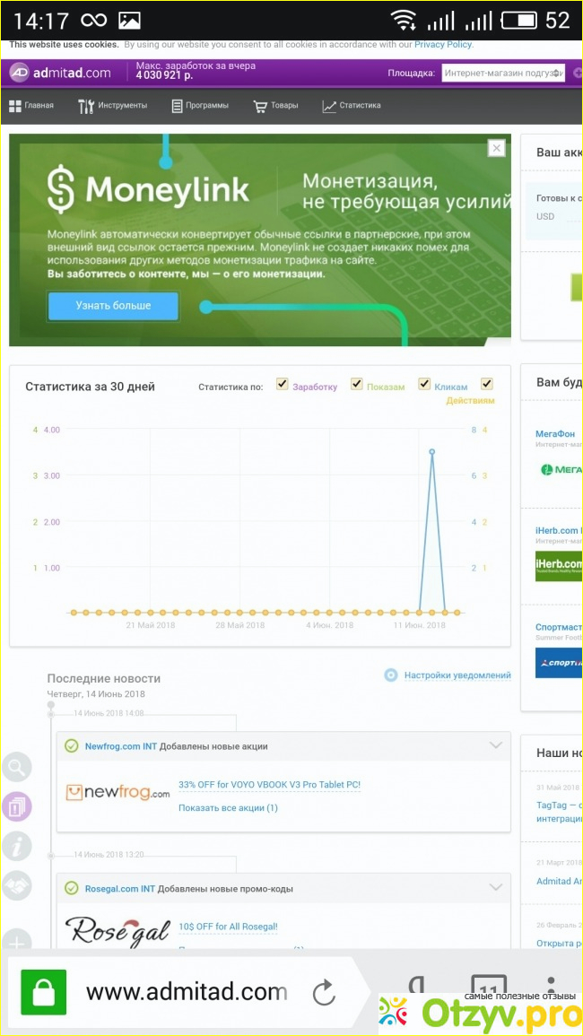 Подключил свои группы в соцсетях к ПП "Адмитада" восемь месяцев назад. Параллельно публикую платные посты и размещаю таргет. В целом получается неплохо, мой ежемесячный доход уже перевалил за 70 000 и продолжает увеличиваться.
