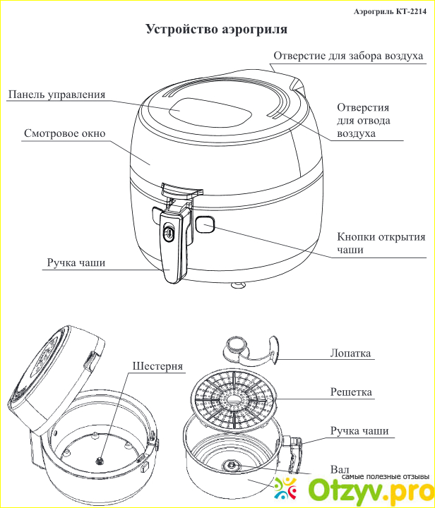 Еще хочу сказать про безопасность. Во время работы аэрогрили держите подальше своих детей от техники. Ведь речь идет о высоких температурах, тем более под воздействием горячего воздуха. Это не шуточки, поэтому нужно соблюдать правило безопасной эксплуатации аэрогрили. Подробно про этот момент написано в руководстве. С ней Вам нужно будет ознакомиться в первую очередь.