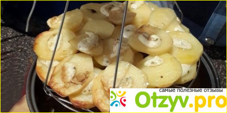 Продукты равномерно готовятся со всех сторон, при этом я не использую масло для мяса, не жарю его в масле, а только в собственном соку или в том что осталось от маринада. С картофелем всё тоже самое. На дне вода, потому ничего не пригорает. Для того, чтобы всё достать, я пользуюсь держателем, очень удобная штука.