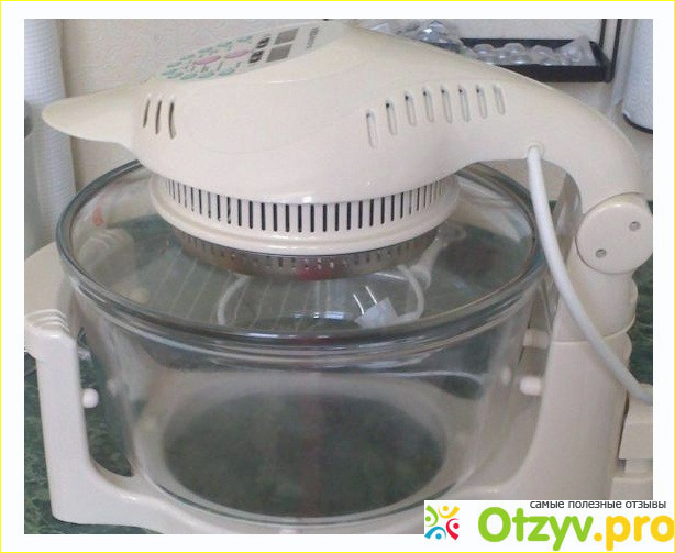С внутренней стороны крышки есть галоген и вентилятор, за счёт их работы нагретый воздух циркулирует по камере аэрогриля, впоследствии чего и готовится пища.