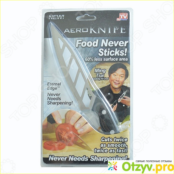 На кухню – с хорошим настроением. Так можно охарактеризовать аэронож, который, как утверждает реклама, не нужно затачивать, очищать каждые пять минут от остатков продуктов. Достигается это за счет особого расположения режущей кромки, ромбовидных отверстий в нержавеющем полотне ножа.