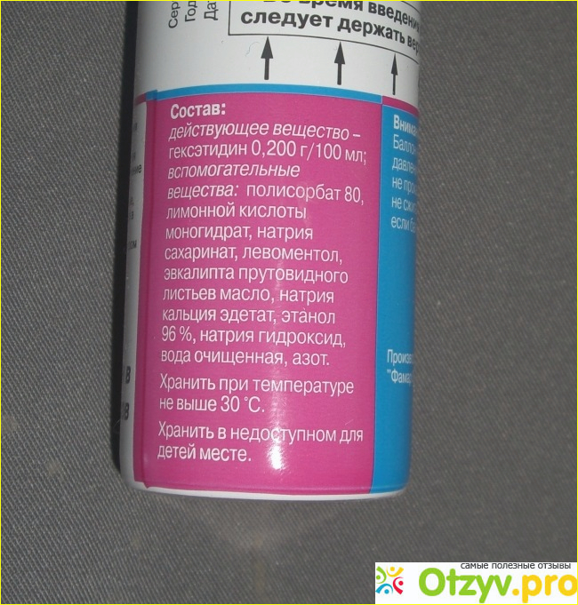 Препарат достаточно дорогой, но он того стоит. Баллончик с аэрозолем небольшой, 40 мл. На нем иллюстрировано как нужно и как нельзя им пользоваться. Использовать его необходимо в течение 6 месяцев после первого применения. Мы сначала после приема пищи полощем горло ротоканом или мирамистином, а затем орошаем этим спреем в течение 2 секунд по кругу все горлышко. Действие его активно в течение 12 часов, между ним можно пользоваться другими антисептическими препаратами. В общем спрей хороший, действенный, снимает боль и воспаление в горле быстро и эффективно, но на начальной стадии заболевания. Принимать можно и детям начиная с 3-х лет. Этот аэрозоль у меня в аптечке хранится всегда на всякий случай справится с болью, отеком, инфекцией и воспалением в горле. Побочных эффектов никогда у нас не было. Необходима консультация специалиста. Рекомендуем. Будьте здоровы! Не болейте!
