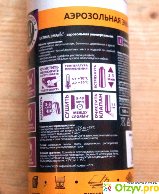 Производителем данной эмали является страна Китай, но все надписи на баллончике написаны на русском языке. Надписи на баллончике довольно информативные и позволяют покупателю получить полную информацию о предназначении этой эмали, об её технических характеристиках, узнать состав, условия хранения, меры предосторожности при работе с ней и много еще полезных вещей.