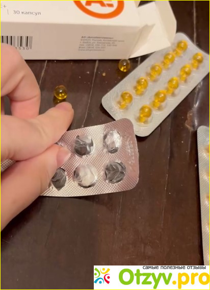 Внутри коробочки находится 3 блистера по 10 капсул в каждом. Отделения для капсул прозрачные, можно сразу увидеть, что они желтого цвета и круглой формы. Сзади также указывается полный состав средства, что бывает крайне редко на блистерах. Помимо них в коробке находится небольшая инструкция с указанием по использованию препарата. В частности, из неё можно узнать некоторые необходимые данные.