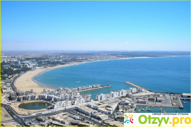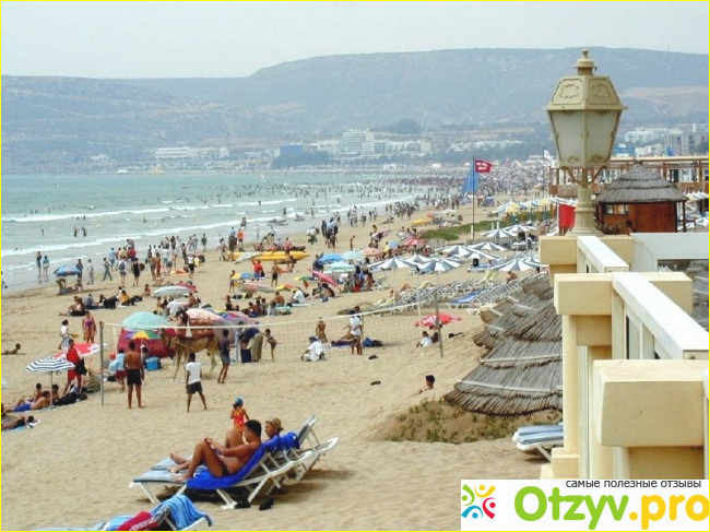 А из многочисленных положительных моментов такого отдыха так же отмечают и то, что главная прелесть Агадира заключается в длиннющем пологом мелкопесчаном пляже, так же здесь всегда очень чисто, вода на столько прозрачная, что можно разглядеть весь подводный мир, пляжи хороши тем, что много отличных мест для сёрфинга, так же за последнее время все больше становится актуальной рыбалка, пляжи напичканы буквально пещерами, так же хвалят за не дорогие кафе где в огромном ассортименте представлены ассорти из морских продуктов, можно выбирать в свежем варианте и просить, чтобы приготовили именно так, как вам того хочется, так же есть мангалы, где можно все это приготовить самостоятельно, в том числе и ваш улов с рыбалки.