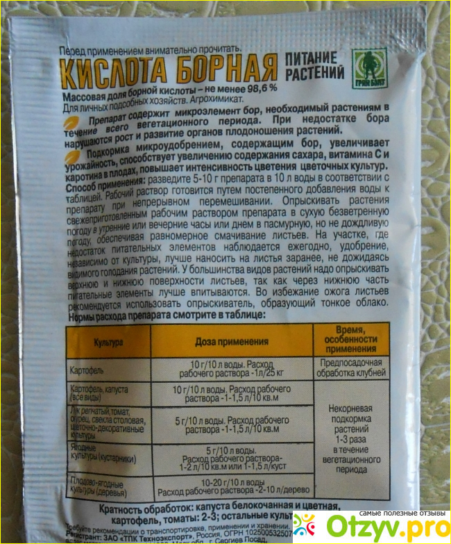 Производитель этого агрохимиката утверждает, что овощные и плодово-ягодные культуры, обработанные H3ВO3, будут обильнее плодоносить, а в последующем их плоды и ягоды - обладать более богатым составом по сахарам и витаминам, чем те, которые испытывали дефицит бора.