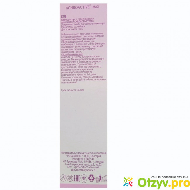 Давно слышала много положительного касательно такого косметического средства. Пишут в основном то, что это эффективный отбеливающий крем Achroactive Мах, то есть он убирает все пигментные пятна, старые следы, которые остались после того, как были неудачно выдавлены прыщи. Так же из хорошего не редко на форумах отмечают то, что это уникальный крем, созданный болгарскими косметологами, он идет на проверенном и качественном натуральном составе, а его эффективность давно доказана.