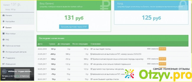 На скрине видно, что заблокировано 125 рублей, и на баланс внутри сайта уже перечислено 131. Эти две статьи написаны в течение суток, на каждую потрачено час-полтора.
