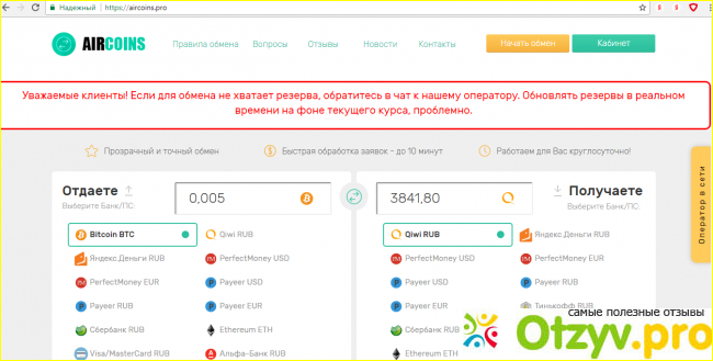 Поддержка от них работает только в их сторону. На самом сайте вам моментально отвечает оператор на все ваши вопросы, которые вас интересуют, после обмена электронными деньгами оператор замолкает навечно, можно зайти с другого устройства и оператор сразу начинает вам отвечать, но как только вы спросите что нибудь о переводе или об оплаченной заявке на перевод оператор сразу замолкает. Через 2-3 дня у вас вообще отключают чат, в контактах у них написан телефон и электронная почта, телефон постоянно выключен, а на электронную почту никто не реагирует. На самом сайте выставляют выгодный курс очень близок к реальному курсу в других обменниках, они постоянно следят и меняют его. Я обратился в поддержку qiwi и вместе пробуем заблокировать кошельки киви которые принадлежат этому сайту и его сотрудникам-мошенникам. Надеюсь данная информация про сайт мошенников AIRCOINS поможет многим пользователям сохранить свои денежные средства и не попасться на их действия. Любую информацию подтверждающую мои слова могу предоставить.
