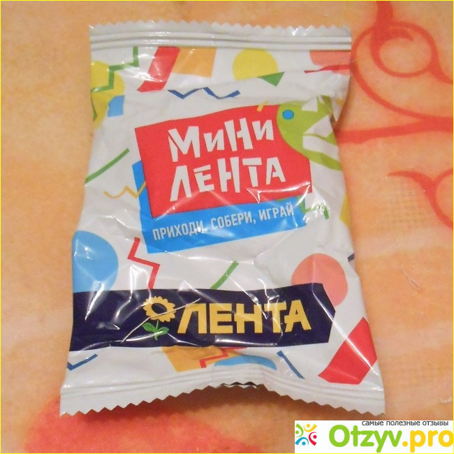 В гипермаркетах Лента проходит очередная бесполезная акция, суть которой состоит в следующем - при определенной покупке в данной сети магазинов выдают в подарок игрушку Мини-Лента. Эти игрушки, как следует из надписи на упаковке, предназначены для детей от 6 лет, причем пользоваться ими рекомендуется при наблюдении взрослых. Игрушки представляют собой мелкие предметы, имитирующие различные продукты.