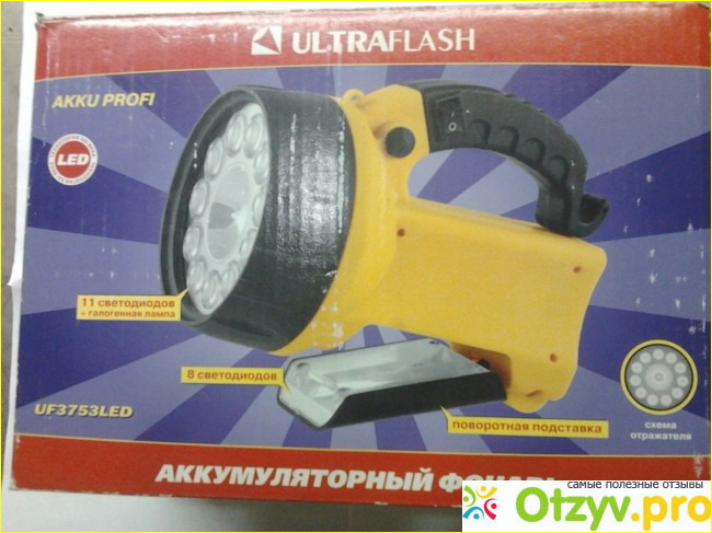 Добрый вечер! Аккумуляторный фонарь UF3753LED Ultraflash приобрел для своего хозяйства, на случай если отключат электричество. Фонарь большой, достаточно удобно держится в руке. В нем встроено 11 светодиодов и одна галогеновая лампа.