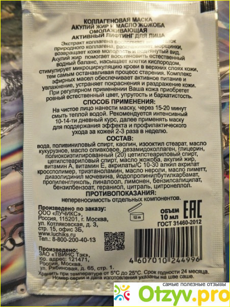 Отправилась на этот раз в аптеку (люблю покупать там шампунь), провизор предложила мне выбрать маску на акульем жиру (их очень много, я растерялась) - взяла маску для лица ЛУЧиКС "Акулий жир с маслом жожоба" для пробы один пакетик за тридцать рублей.
