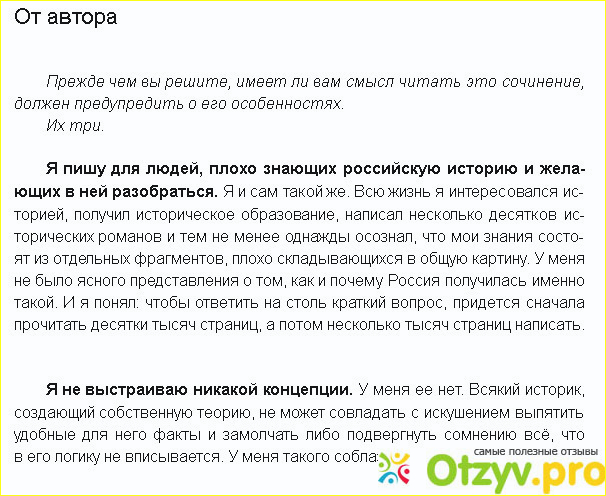 Мне нравится, что автор не претендует на роль историка или правдописца. Борис Акунин совершенно искренне и открыто предупреждает о том, что перед нами больше художественная литература, и писатель имеет право на собственный взгляд на все исторические события. Тот факт, что перед тем, как издать книгу История государства российского Акунин очень хорошо проштудировал авторитетные источники, отрицать бессмысленно.