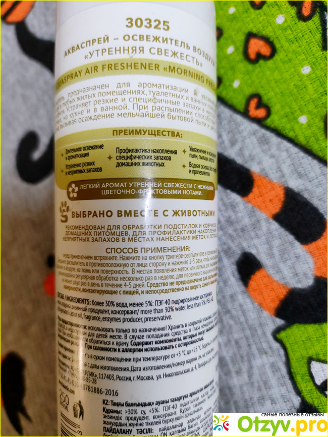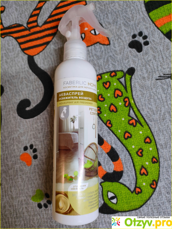 Кстати, им можно обрабатывать и подстилки и коврики домашних животных и это абсолютно безопасно. Этот акваспрей увляжняет воздух, освежает его. И при этом способствует, чтобы пыль и шерсть оседала, а не летала в воздухе. На мой взгляд, у этого освежителя масса преисуществ по сравнению с другими аналогами.