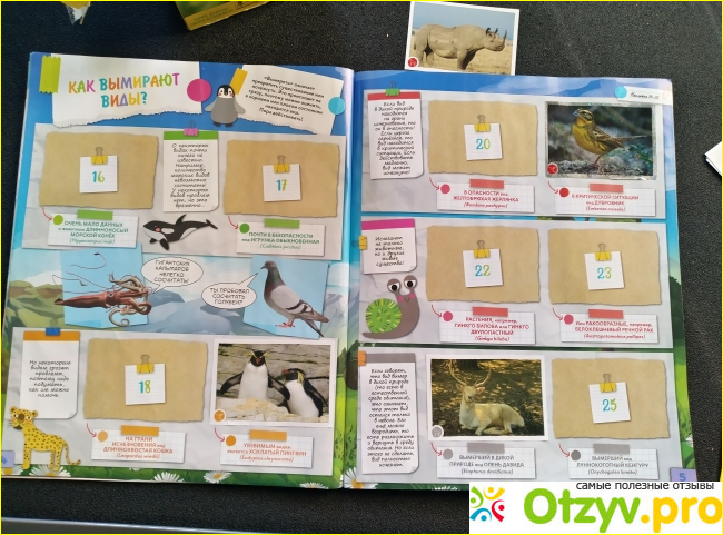 Обошлось мне все в 500 рублей, в наборе был альбом и блистер с 30 наклейками. Обложка альбома плотная, а внутри красочные страницы с разными заданиями, тест, загадки, познавательные факты о животных. Альбом не выглядит толстым, но 48 страниц и 276 наклеек на них — этого хватит реально надолго. Еще есть постер с вымершими животными и животными из красной книги. На нем тоже нужно собрать наклейки, а потом планируем повесить его на стену в детской..