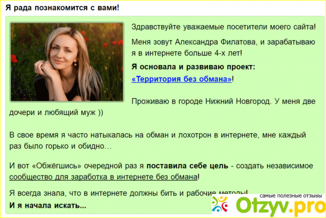 Сегодня я хочу поделиться с Вами очередным заработком ( читаем разводом ) в сети интернет, такой как заработок на платформе "Территория без обмана Александры Филатовой". На первый взгляд все довольно красиво. Зарабатываем деньги, выводим их моментально.