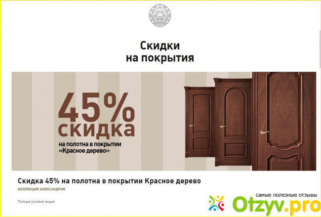Следующий раздел Меню сайта – Акции, в котором я узнал о различных скидках, действующих при заказе дверей. Например, при заказе дверей из коллекции «Александрия» действует скидка 45% на полотна цвета «Красное дерево»