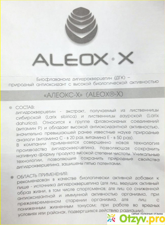 Почитал в инструкции, выяснилось, что Aleox-X это дигидрокверцетин, который сейчас очень на слуху.