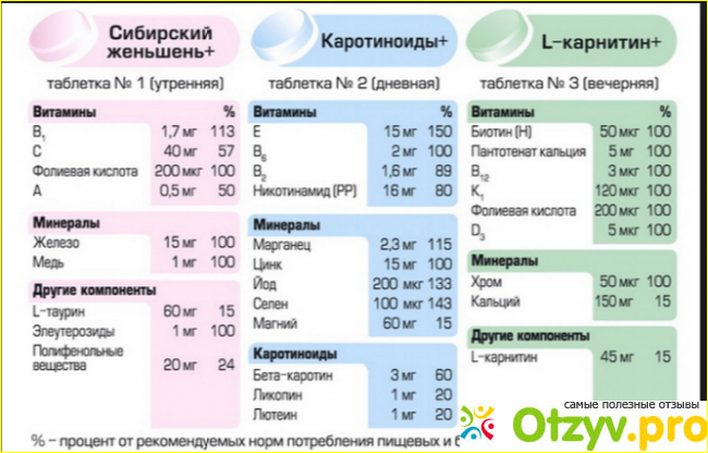 Экстракт зеленого чая, витамин А-ретинола ацетат, аскорбинка, железо, фолиевая кислота - это в принципе все, что мне понятно из состава, который указан в инструкции и на самой упаковке витаминок. Все остальное уже понятно только химикам и фармацевтам, как по мне. Ну и ладно, это меня устраивает, единственное, что не очень понравилось - это наличие красителей. То ли они для того, чтоб не спутать когда какую таблетку- вернее витаминку принимать, то ли для чего другого? В общем, это минус, и минус еще то, что хватает данной упаковки всего на 20 дней, если посчитать все количество и подбить итог по дозировке и применению - каждый день по три таблеточки-витаминки, причем утром одна, днем-вторая, вечером - третья - у всех цвета разные, что очень удобно и не запутаешься, когда какую принимал. А вот ниже кстати изображение состава всех трех витаминок - как видите, в первой тот самый сибирский женьшень, который и отличает этот комплекс от женского, в остальном все тот же состав, сравнивала со своими, аналогичными.