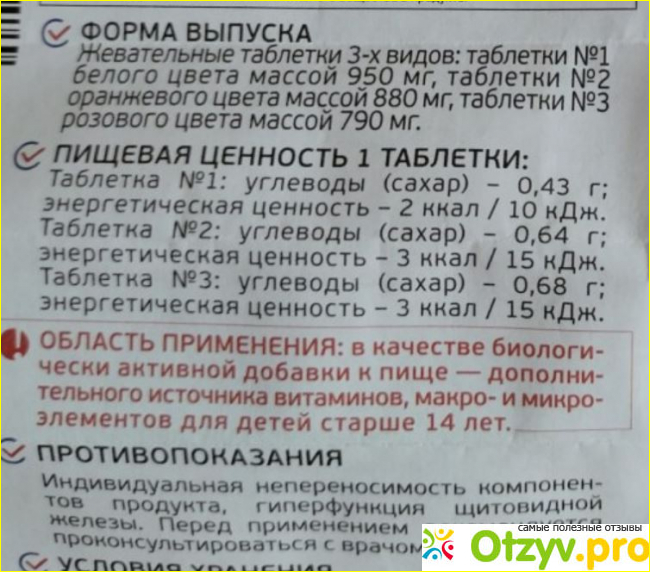 Вторая оранжевая таблетка уже имеет соответственно цвету вкус апельсина. Туда также входит крахмал, сахарная пудра, красители и другие наполнители. Полезными веществами выступают витамины С, Е, В2, В6, А, а из минералов здесь находится магний, цинк, марганец, йод, селен и молибден.