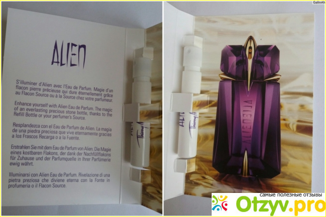 Я уже давно искала подходящий для себя древесно-цветочный аромат. И вот наконец-то мне удалось это сделать. Когда я в первый раз услышала аромат Alien Mugler, то просто влюбилась в него. На сколько он мне сильно импонирует. Этот аромат очень интересно раскрывается и на моем теле он ощущается дерзко, но в тоже время притягательно. Также не могу не отметить красоту флакона, в котором находится туалетная вода. Это настоящее искусство. В общем я для себя наконец-то нашла подходящий аромат, который идеально подошел мне.